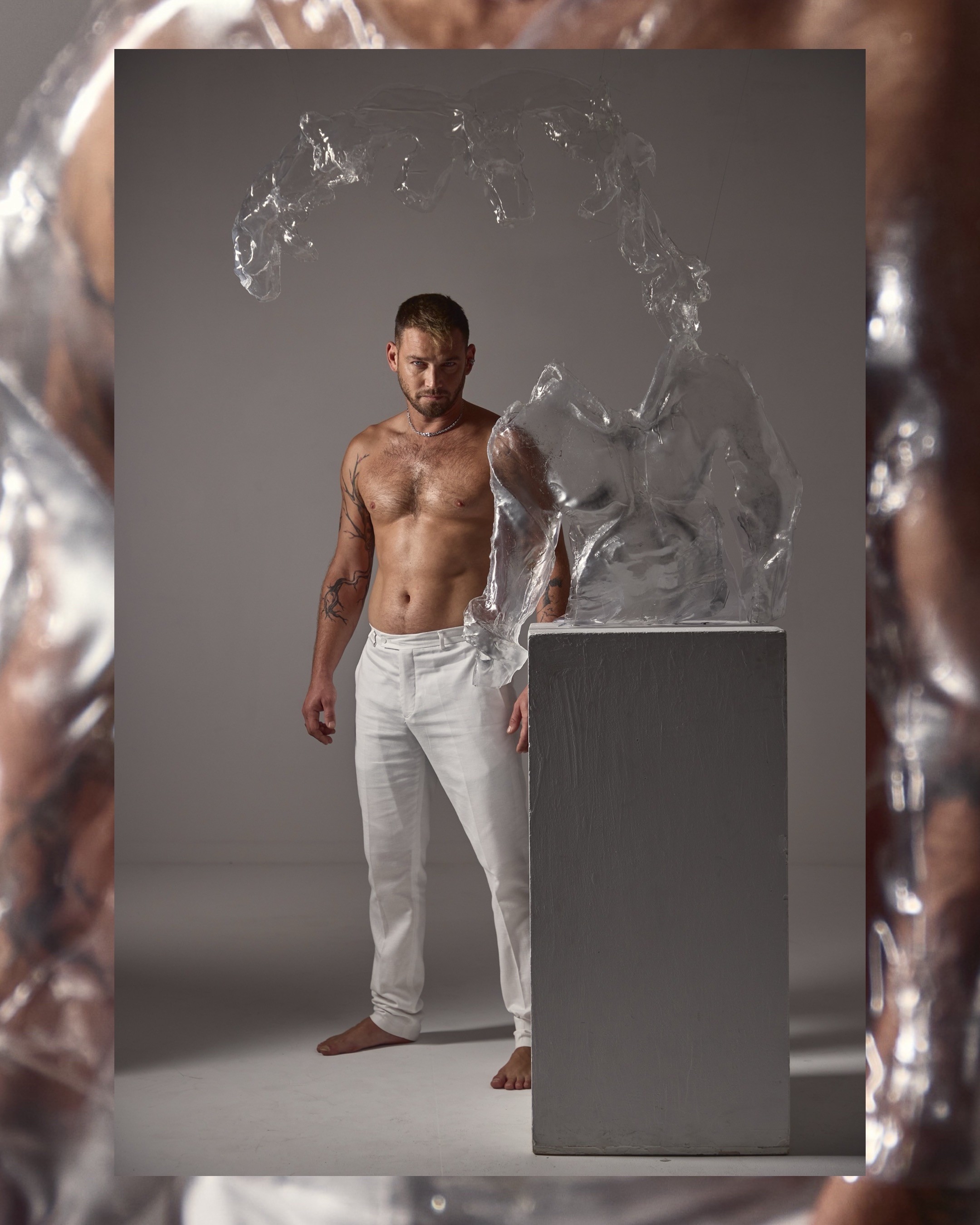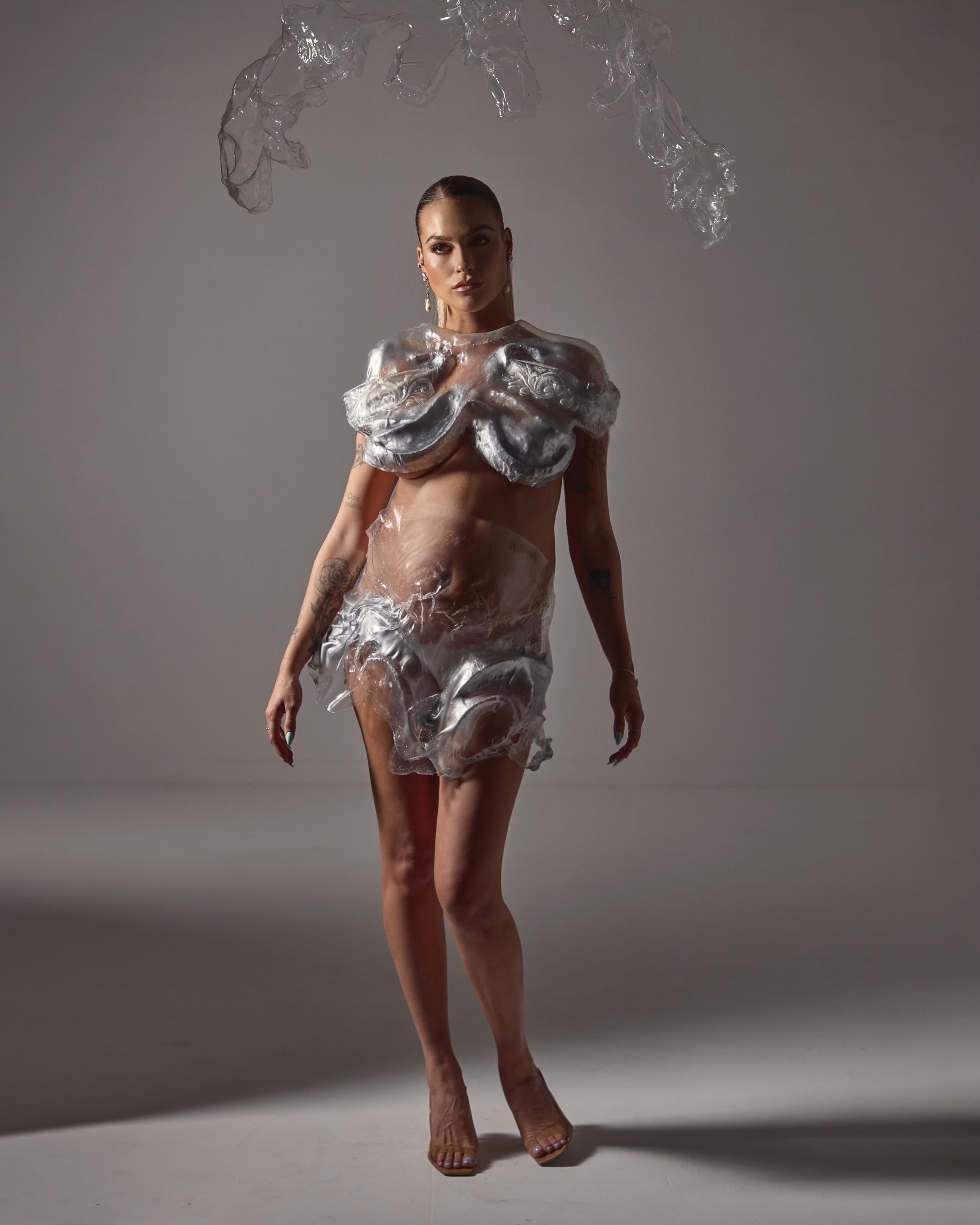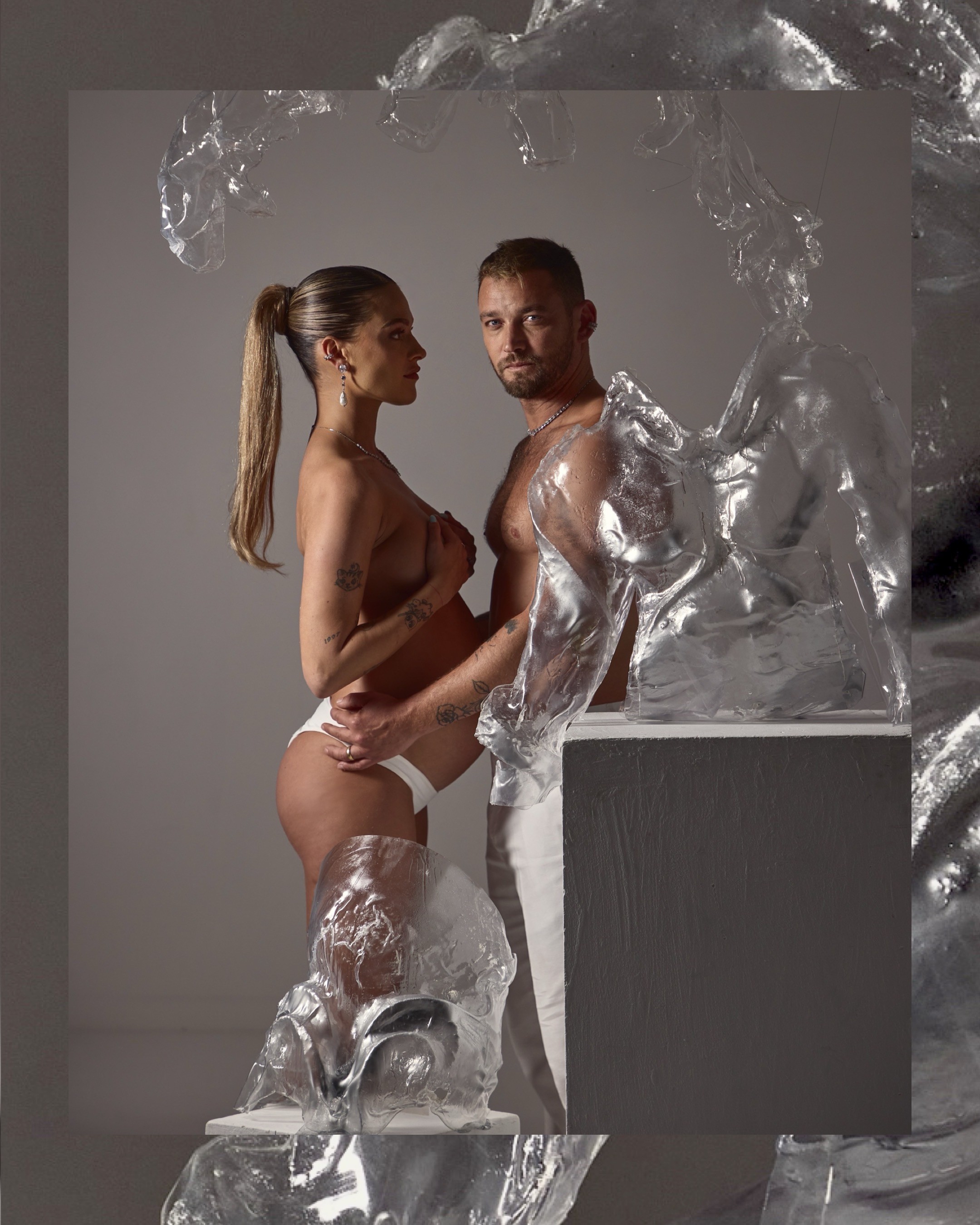 For this intimate pregnancy shoot with actor Dean Miroshnikov and his wife Annie Miroshnikov, who celebrated their journey toward parenthood. The creation celebrates both vulnerability and strength, and inspired by futuristic science-fiction theme. These forms are meant to empower the couple, allowing light to pass through while referencing to metallic dynamic shapes that symbolize protection and unity.
