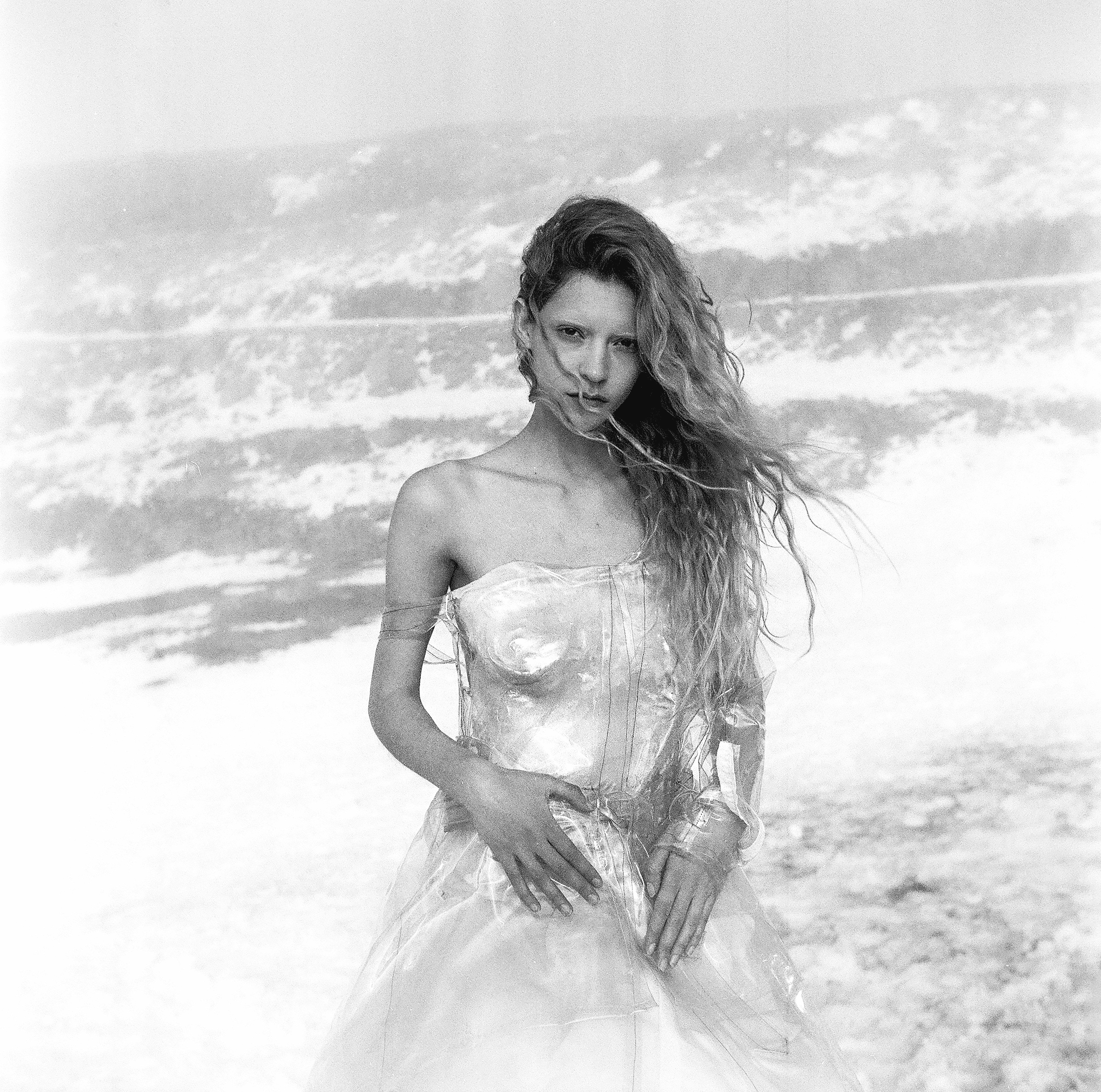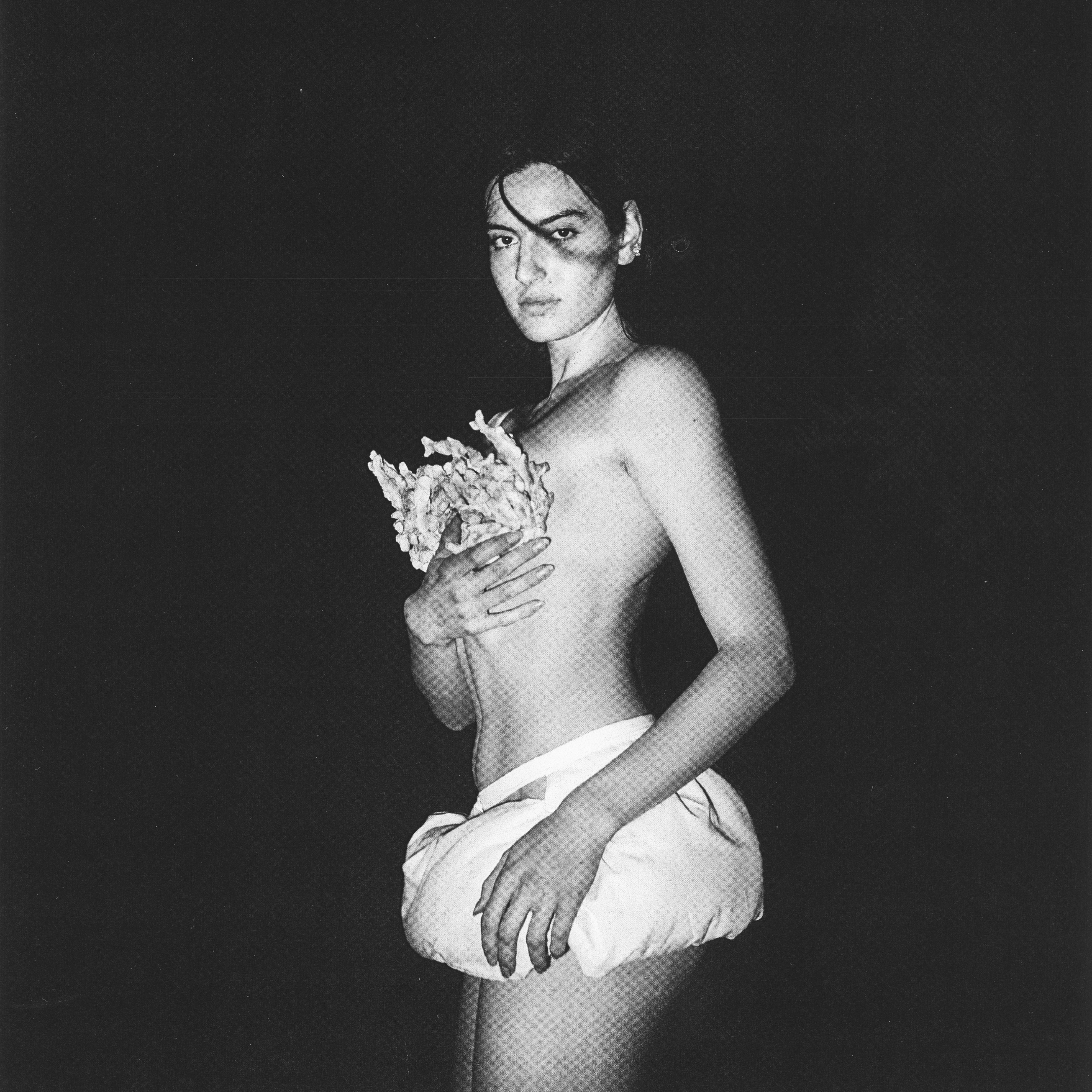 At the solo exhibition and book launch “Me? Never”, Matan Meirson engages with the experience of presence, the perception of place in a world where the body appears as a site of tension. The body of images was created and curated around contrasts between alienation and warmth, latent beauty and connection, between opaque and transparent, breathing elements; between the desire to be seen and the impulse to disappear. Each image contains a texture produced specifically for it and manually scanned, much like a handcrafted garment. The custom casting of the body in plaster, model sculpting, and sewing form a slow process that carries within it movements of the psyche. Like fish gathering into a school, so too does the human seek their place - among others, within matter, and within themselves